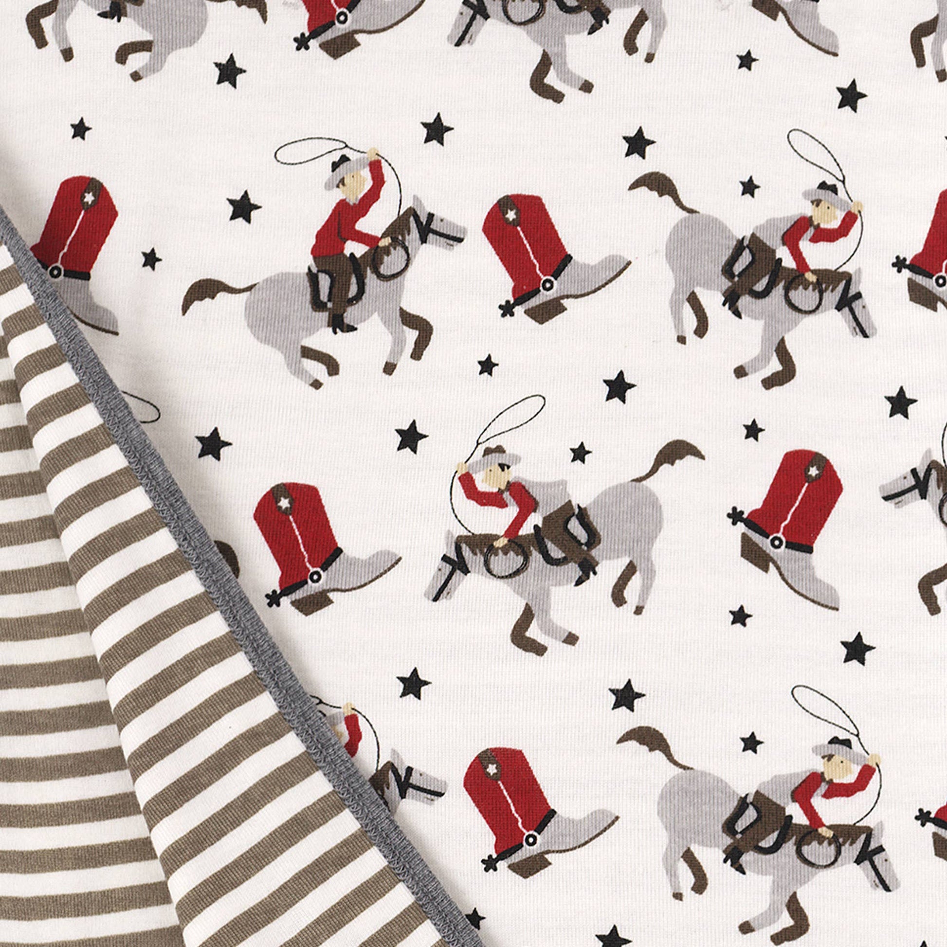 Ride ‘Em Cowboy romper with 2-way zipper closure. He'll look cute and feel comfy in our super soft bamboo/cotton/spandex blend jersey one-piece with cotton rib trim. Has a neck guard for comfort.