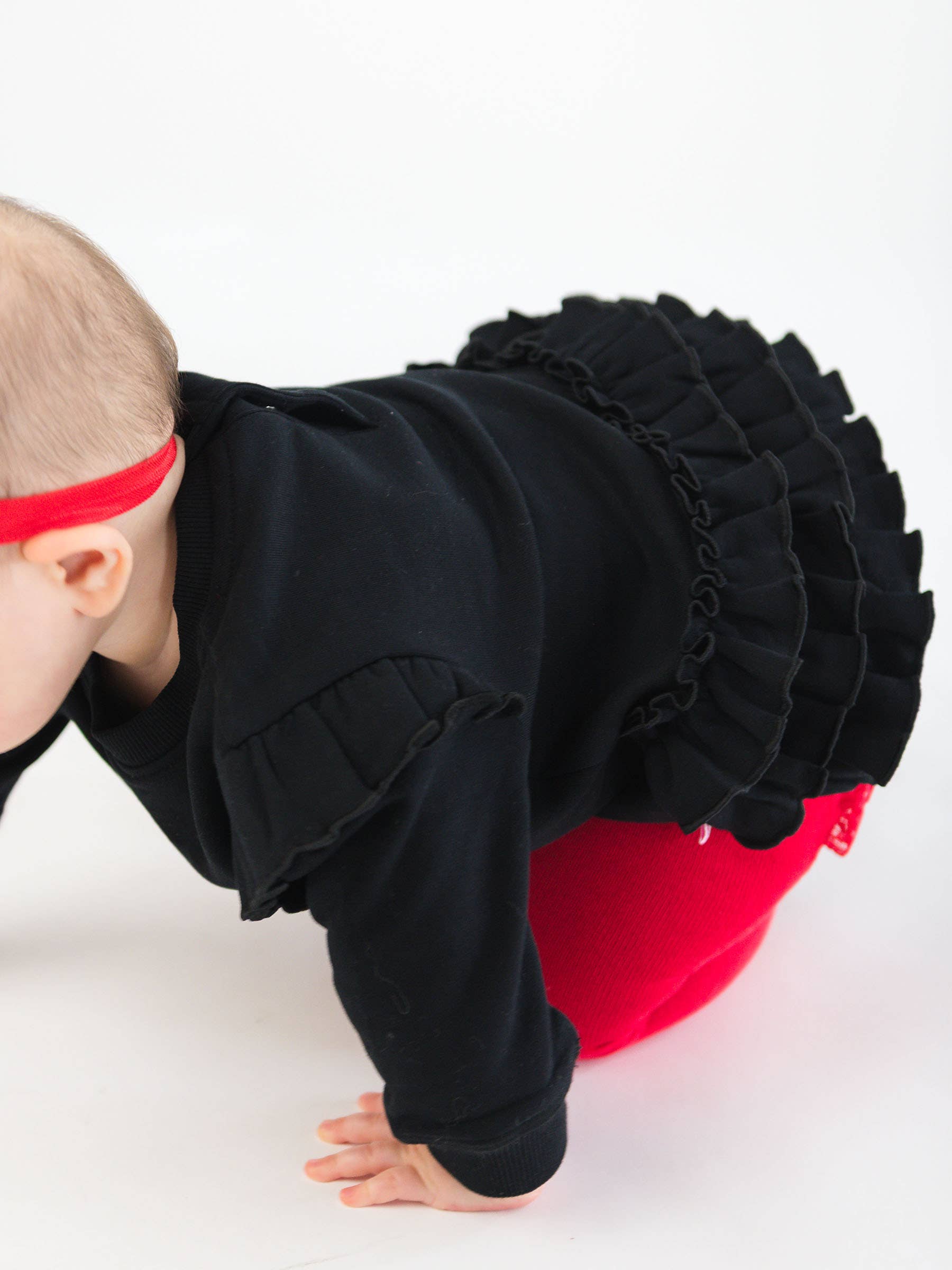 This precious flutter sweatshirt romper features premium, soft knit fabric that will keep little ones cozy all winter long. The flutter sleeve accents make it extra girly, and the applique design adds a special touch. Snaps at the legs make changing a breeze.