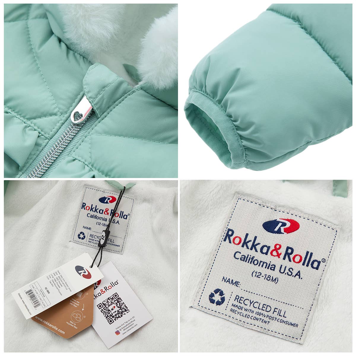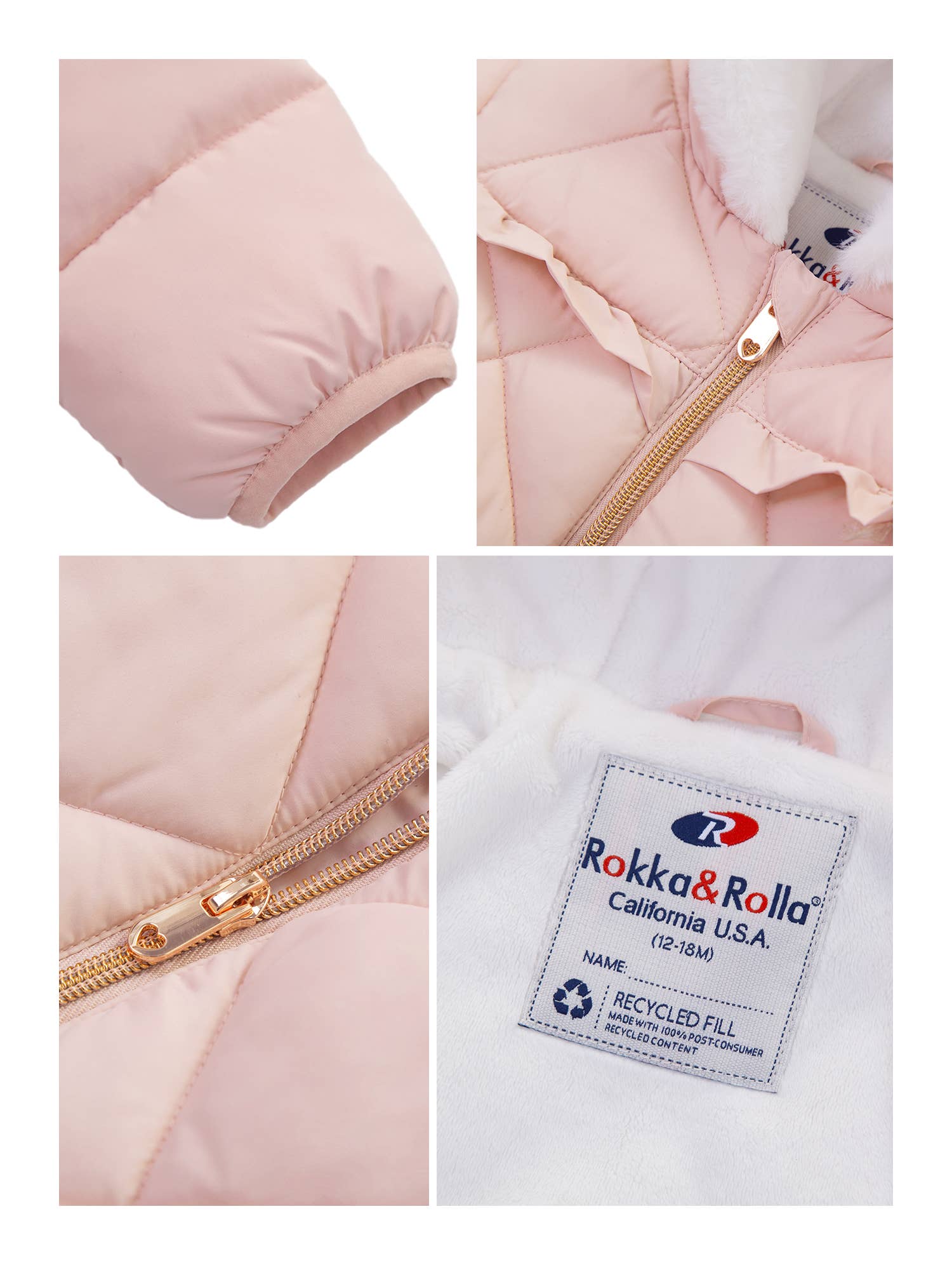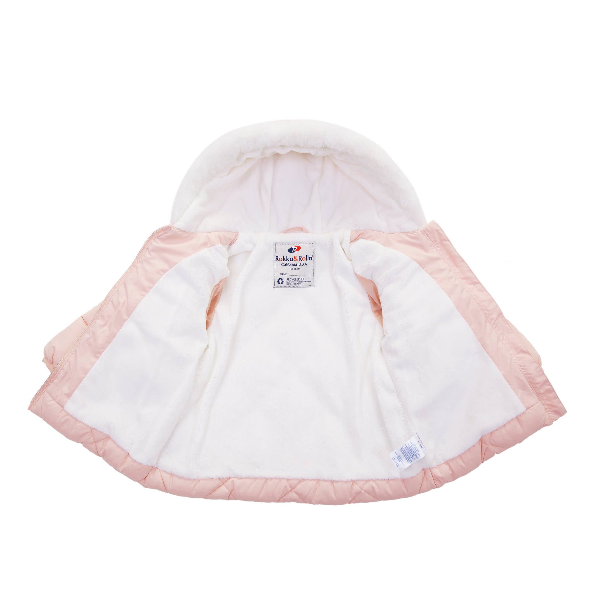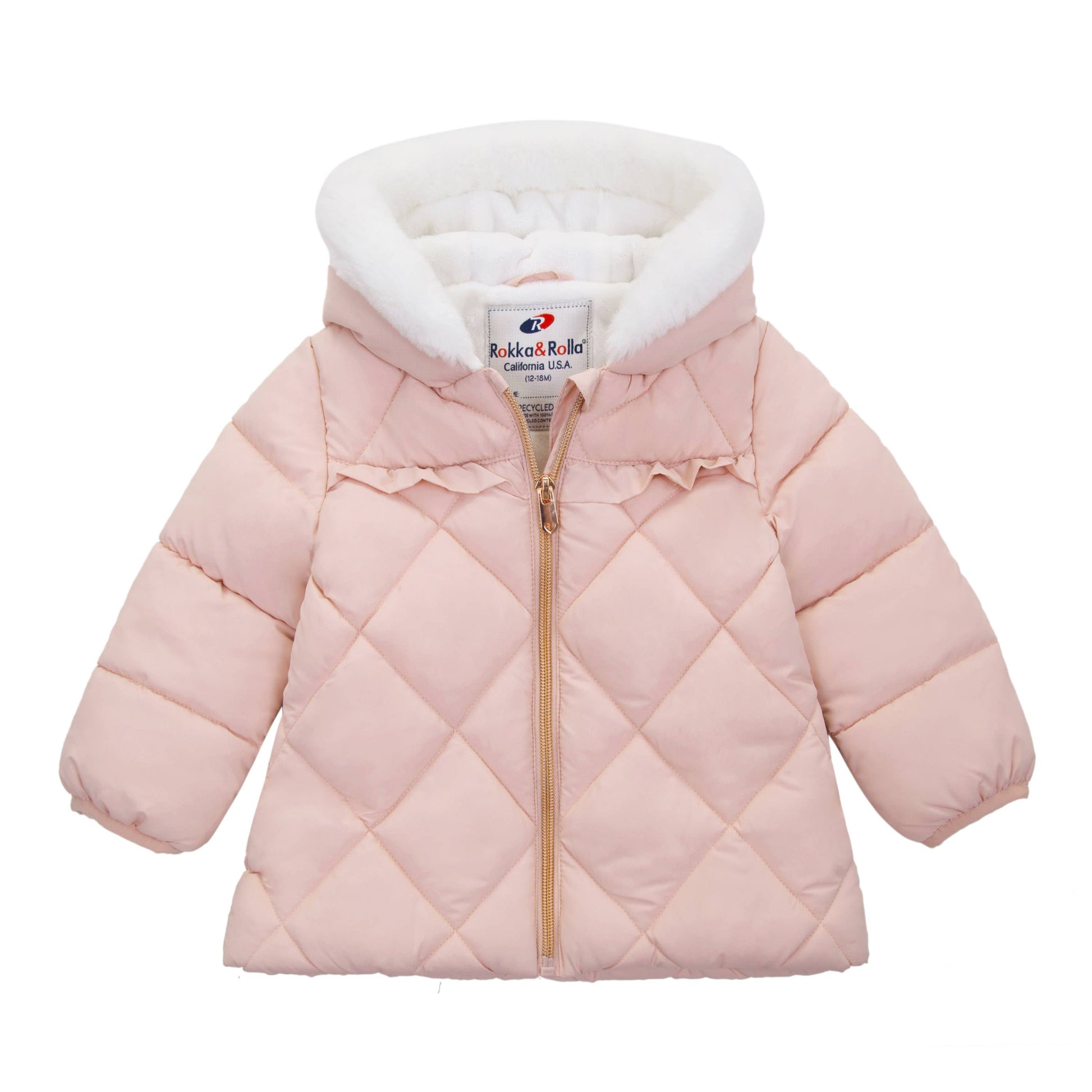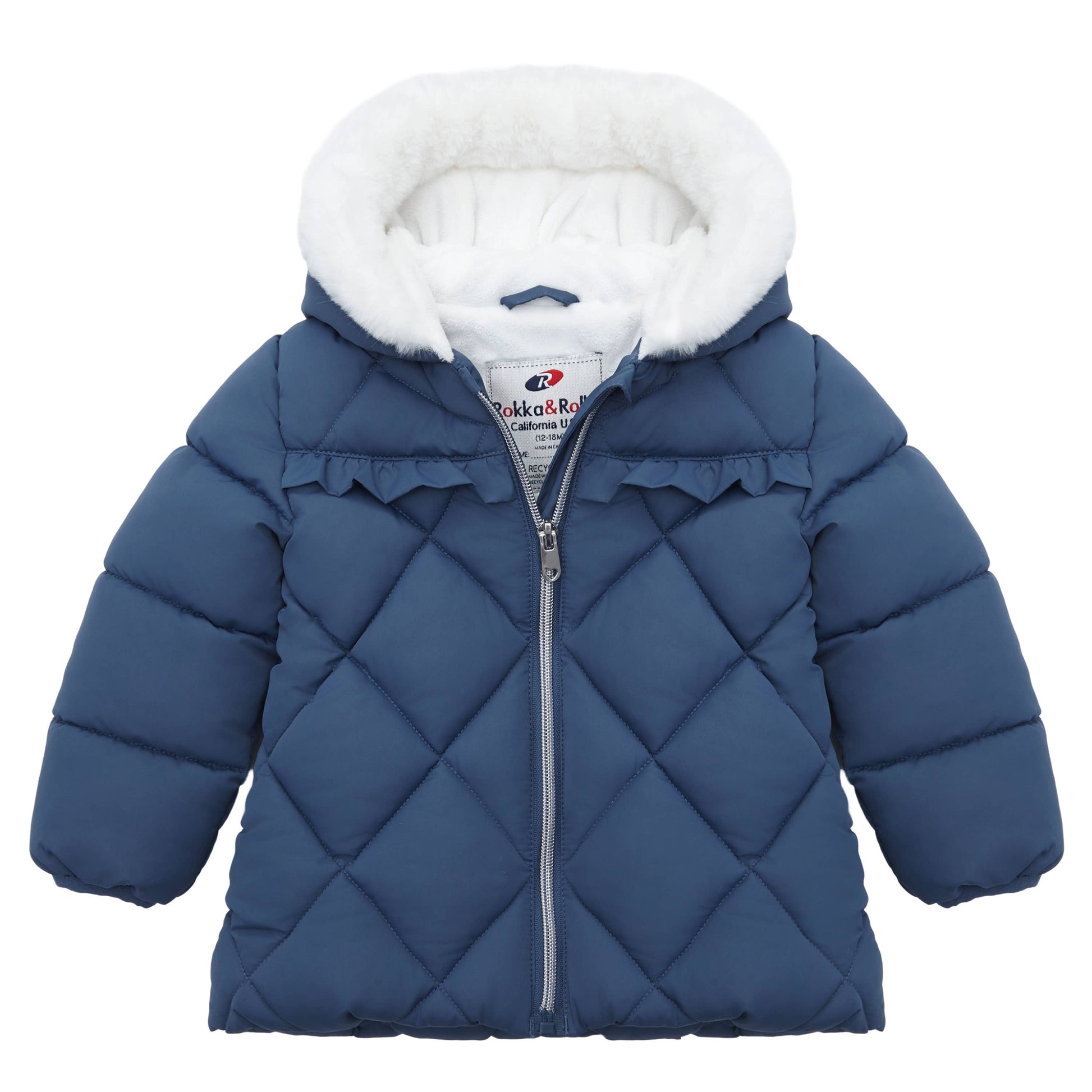 This Rokka & Rolla Baby Girls' Puffer Jacket Toddler Winter Coat for Infants, Sizes 6-24M is a great addition to your kid’s wardrobe. Made from recycled filling that is lightweight and easy to throw on in the mornings when you’re rushing to go outside. Your newborn little girl will look fabulous during photoshoots and shine bright in our winter coat. Our warm hooded fleece lined coat is designed to protect your baby infant from the wind and rain as it is water-resistant. Features • Water-resistant, lightweight warm puffer for baby girls • Down-alternative filling for winter • Quilted shell, fleece lining for snow • Refer to size chart in gallery for US sizing
