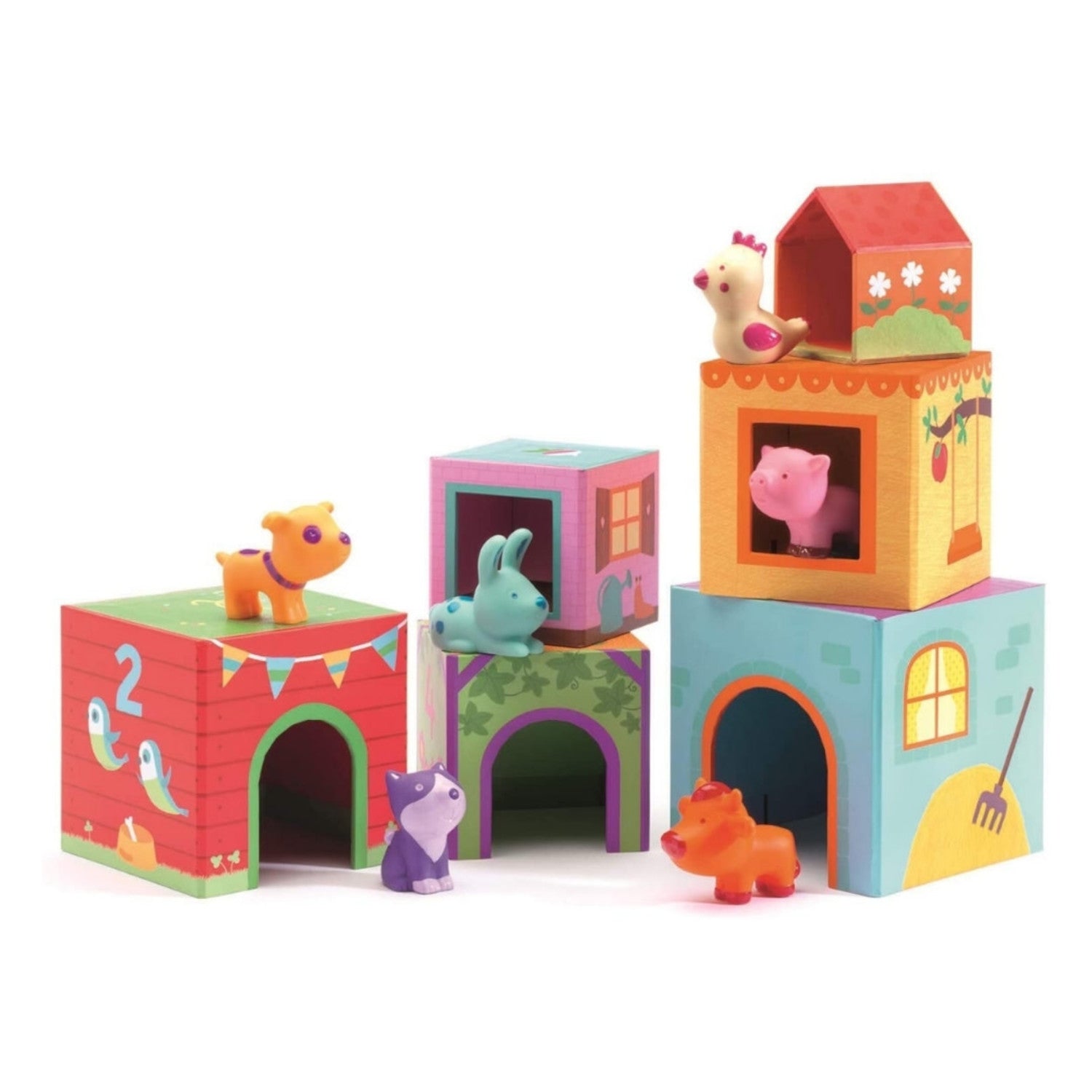 Topanifarm Cubes from Djeco take classic stacking and nesting blocks to another level! Six little block homes, each with cut-out doors, can nestle neatly inside one another, stacked into towers, or be laid out in a row! The bright, appealing colors and images inspire play and imagination in young children! Also included are six fun farm animals (to live within the six block homes), providing children with countless ways to play! Stack, nestle, match, count, and more—and young ones develop their motor skills while they play!
