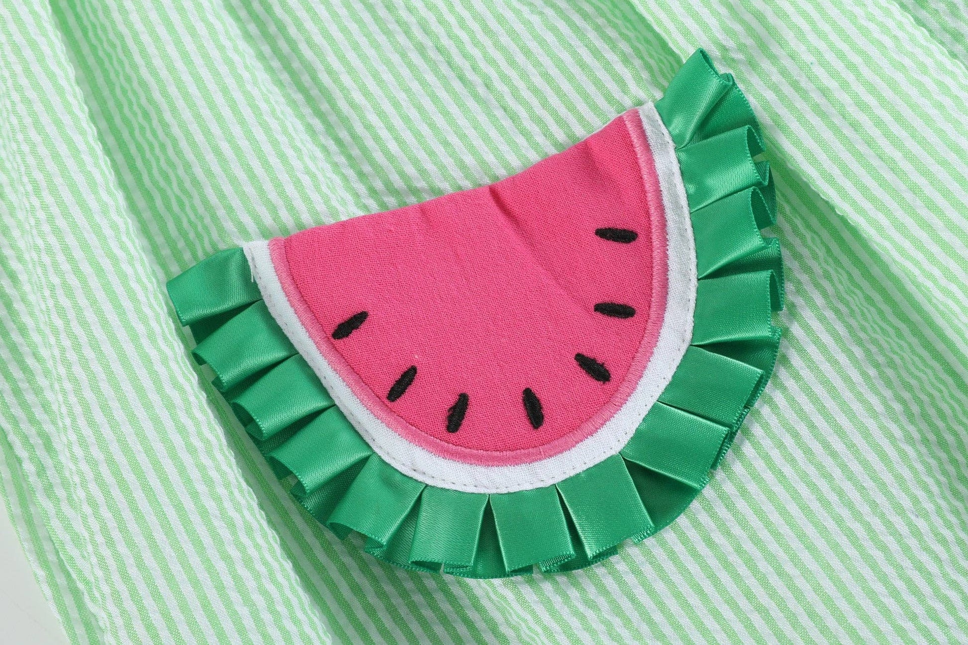 This darling Green Seersucker Watermelon Smocked Bishop Dress is perfect for your little sunshine to make a statement! She'll be sweet as can be in this dress detailed with charming watermelon pockets, green trim, and adorable watermelon embroidery. It's all put together in a soft and comfortable green seersucker — watermelon never looked so sweet!