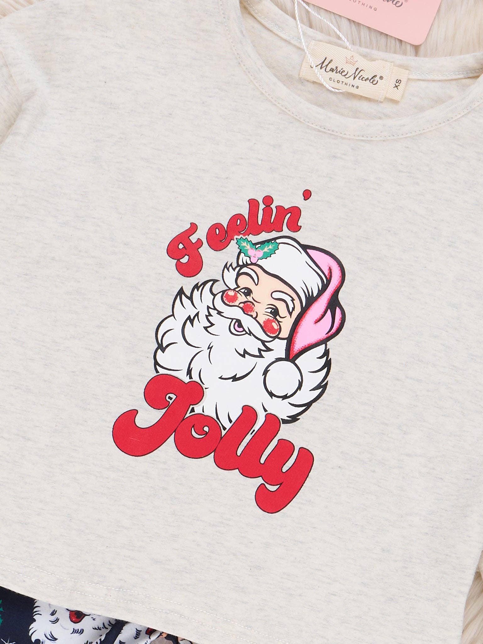 It's Jingle Bell Bottom time! This outfit from Marie Nicole Clothing features a heather grey ruffle sleeve top with a Santa illustration and Santa-printed bell bottoms for a good time. It is fashionable and fun! * Fits true to size. * Top: 97% Cotton / 3% Spandex * Bottom: 95% Polyester / 5% Spandex * Accessories sold separately.