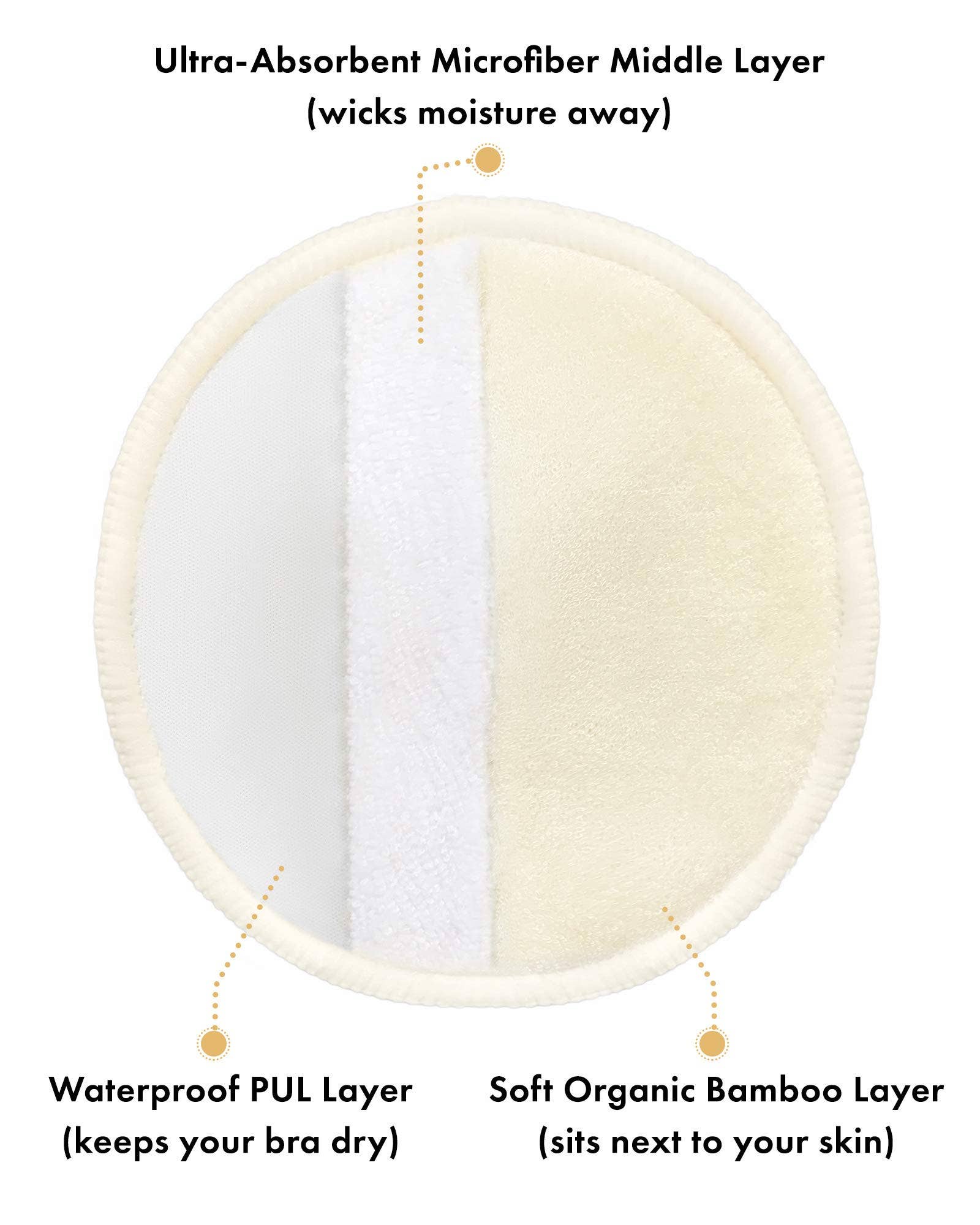 More absorbent and durable than cotton, our Organic Bamboo Nursing Pads are washable, reusable, and ultra-soft. Contoured to fit the shape of your breasts, our nursing pads are the perfect thickness to absorb breast milk without showing through your clothes. Ideal for sore nipples and nursing mothers’ sensitive skin, our Oeko-Tex certified* breastfeeding pads come in a multipack that includes 5 pairs (10 pads) with a cute waterproof bag that’s perfect for carrying wet pads. Use with or without your favorite nipple creams for breastfeeding comfort.